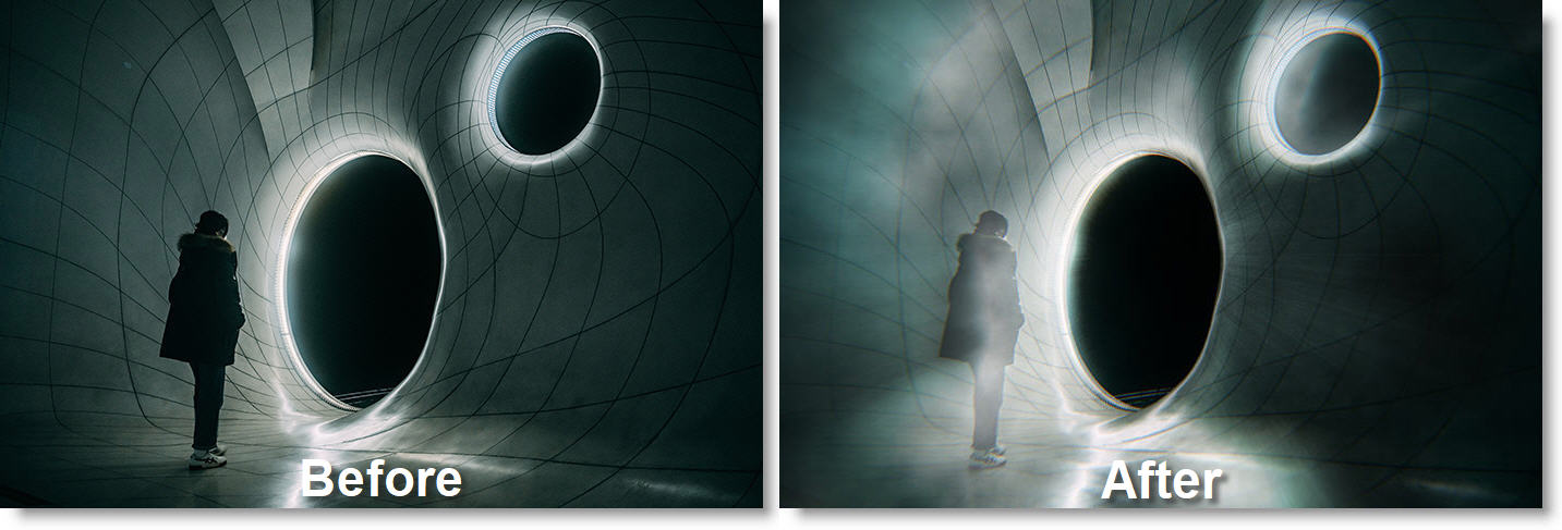 Atmospheric Glow is a glow style mega-filter that brings instant atmospheric looks to an otherwise flat scene. Based around a film glow, this effect includes 9 independently controlled groups, including volumetric light rays, a smoke/fog generator, light flickering, chromatic aberration, optical orbs, film grain and a vignette, each of which adds a new element to the scene.